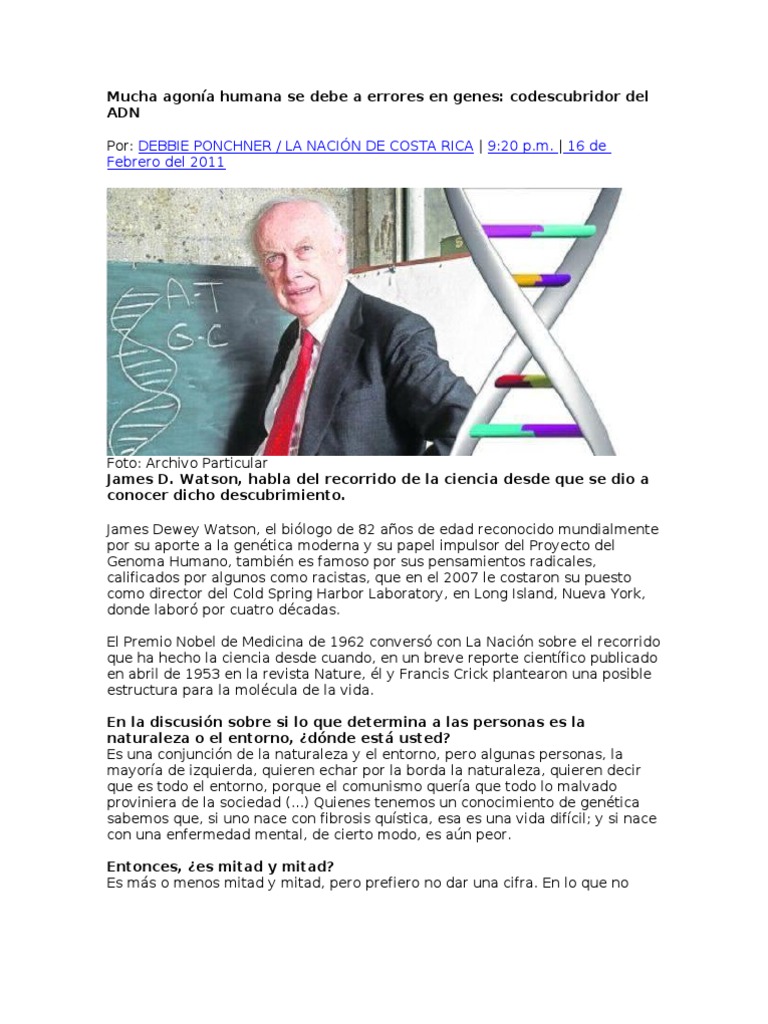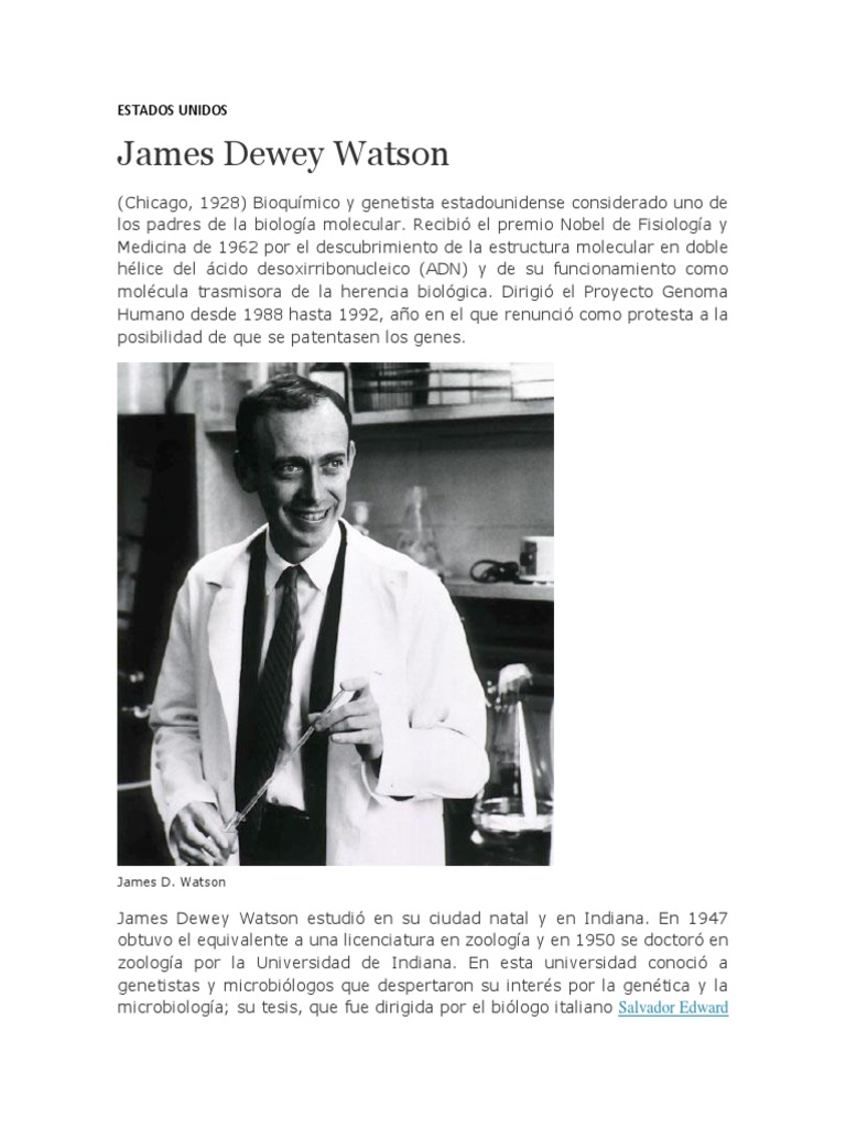 La vida y logros científicos del pionero de la biología molecular James Dewey Watson PDF