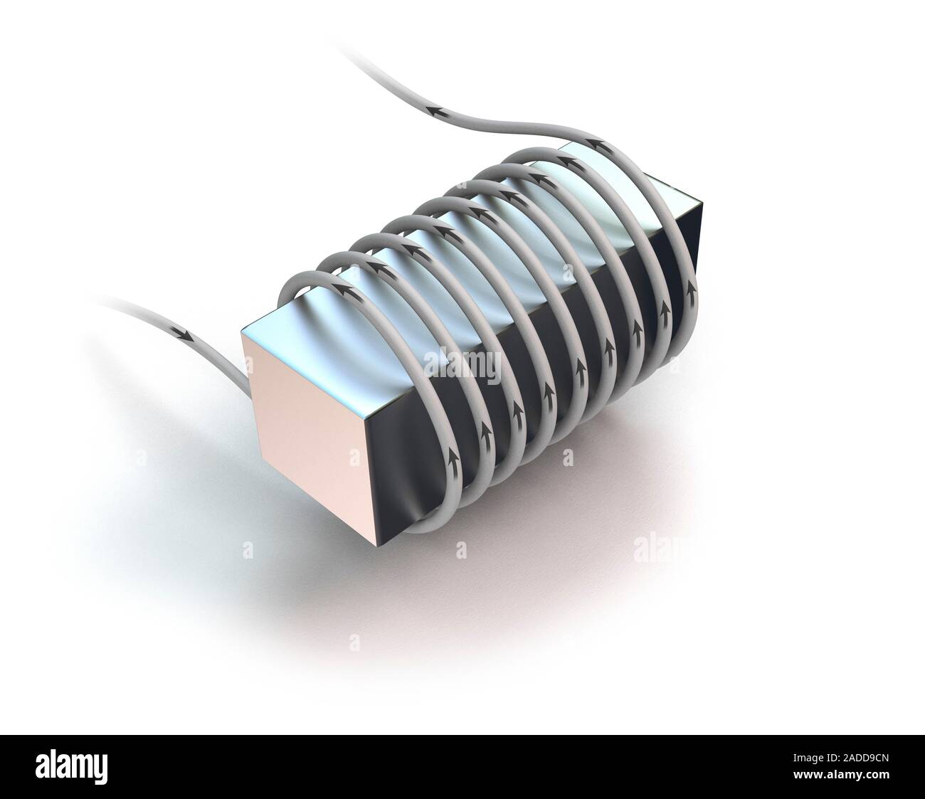 Bobina electromagnética y el núcleo. Ilustración de un cable eléctrico enrollado alrededor de un