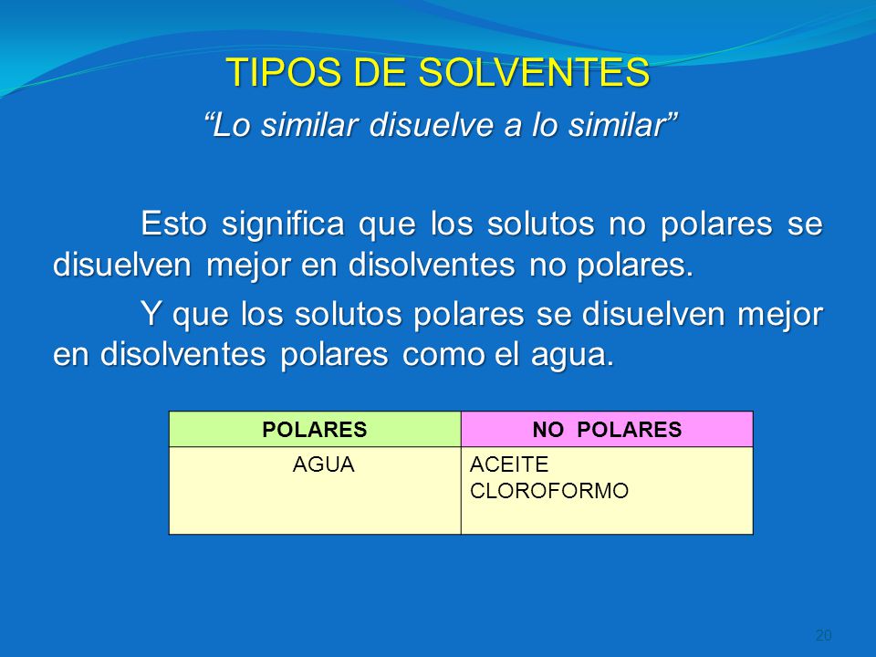 El ejemplo clásico de un solvente polar es el agua. Los alcoholes de bajo peso molecular también pertenecen a este tipo.. Disolventes y reactivos. 1.1 Conceptos generales; 1.2 Disolventes. 1.2.1 Aspectos generales. 1.2.1.1 Clasificación de los disolventes; 1.2.2 Elección del disolvente;