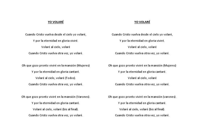 Porque un día volaré, Y ese sol he de cruzar No en una nave espacial Porque un día he de volar ¡Gloria Dios voy a volar! 2da Estrofa: Si lo creo, y lo espero. Sé que pronto ese día llegará Sepas hoy, Recuérdalo. Si te preparas hermano mío También volarás. 3ra Estrofa: Esta aquí, el salvador. Acepta ahora su invitación para volar