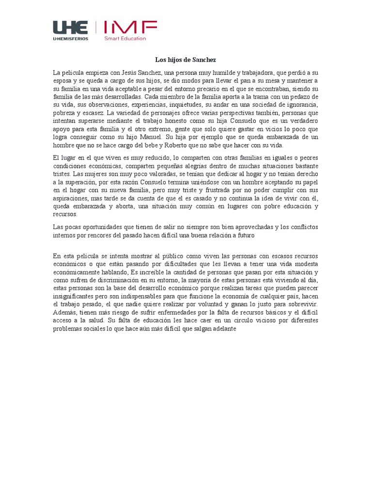 Página 1 de 8. LOS HIJOS DE SÁNCHEZ. Resumen. El libro nos muestra el caso de una familia, en ésta aparece Jesús Sánchez, un hombre que sufre la muerte de su esposa y se queda con sus hijos. Es una familia numerosa y muy humilde, las únicas personas que se encargan de la manutención es la hija llamada Consuelo y Jesús.
