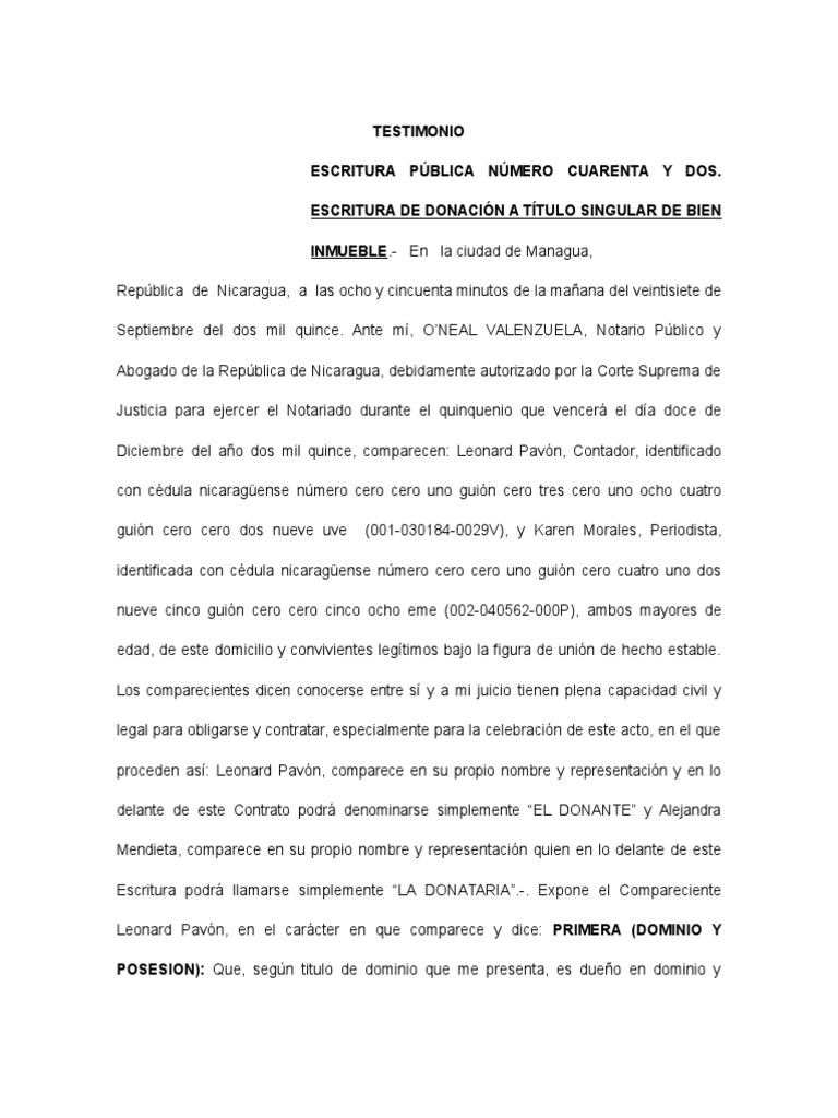 Ejemplo de Contrato de Donación Bien Inmueble PDF Nicaragua Derecho Civil Law)