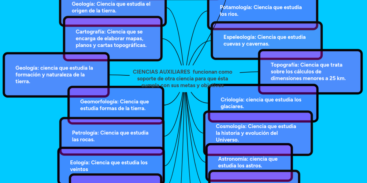 Mapas Mentales Similares Esbozo del Mapa Mental. CIENCIAS AUXILIARES DE LA GEOGRAFÍApor Luz Galván. 1. Espeleología : ciencia que estudia cuevas y cavernas. 2. Edafología: ciencia que estudia los suelos. 3. Criología: ciencia que estudia los glasiares.