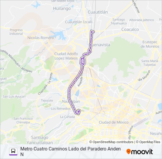 Andenes Cuatro Caminos Metro Toreo . Ruta 118 Metro Pantitlan / Final del anden Tepotzotlan . Ruta: Ruta: Constitución de 1917. Ruta: Ruta 07 Cuartos Izcalli. Ruta Lomas Verdes, UVM, Ruta: Naucalpan CCH , Cruz Roja, Ruta 03 Mundo E , Hospital los Ángeles Interlomas, San Pedro, Atizapan. Ruta 18 Centro Banamex,