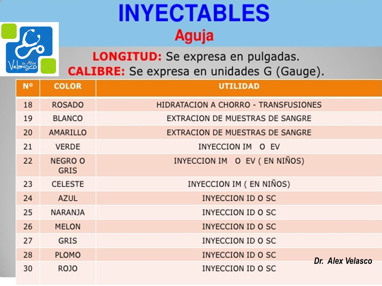 La " G" se identifica con "Gauge", que se refiere al diámetro interno de la aguja. Se mide comparando el flujo que puede pasar por una aguja de gauge conocido. Normalmente la rosa de 18 G se usa en emergencias y la gris 27 G para terapias ya que en la rosa al ser más amplia el fluido pasa con mayor rapidez. GRIS: 27 G. NARANJA: 25 G.
