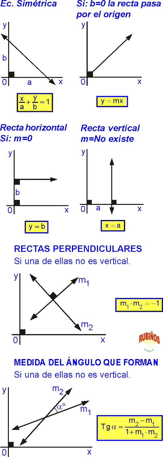 Y la constante y0 que es la ordenada en el origen, es decir, donde la recta corta al eje y. Fórmula. Representación. y = m x + y 0. La fórmula anterior es una de las varias posibles que hay para representar una recta. La llamamos ecuación explícita de la recta. Pulsa la pestaña Ver también para estudiar otras ecuaciones posibles.